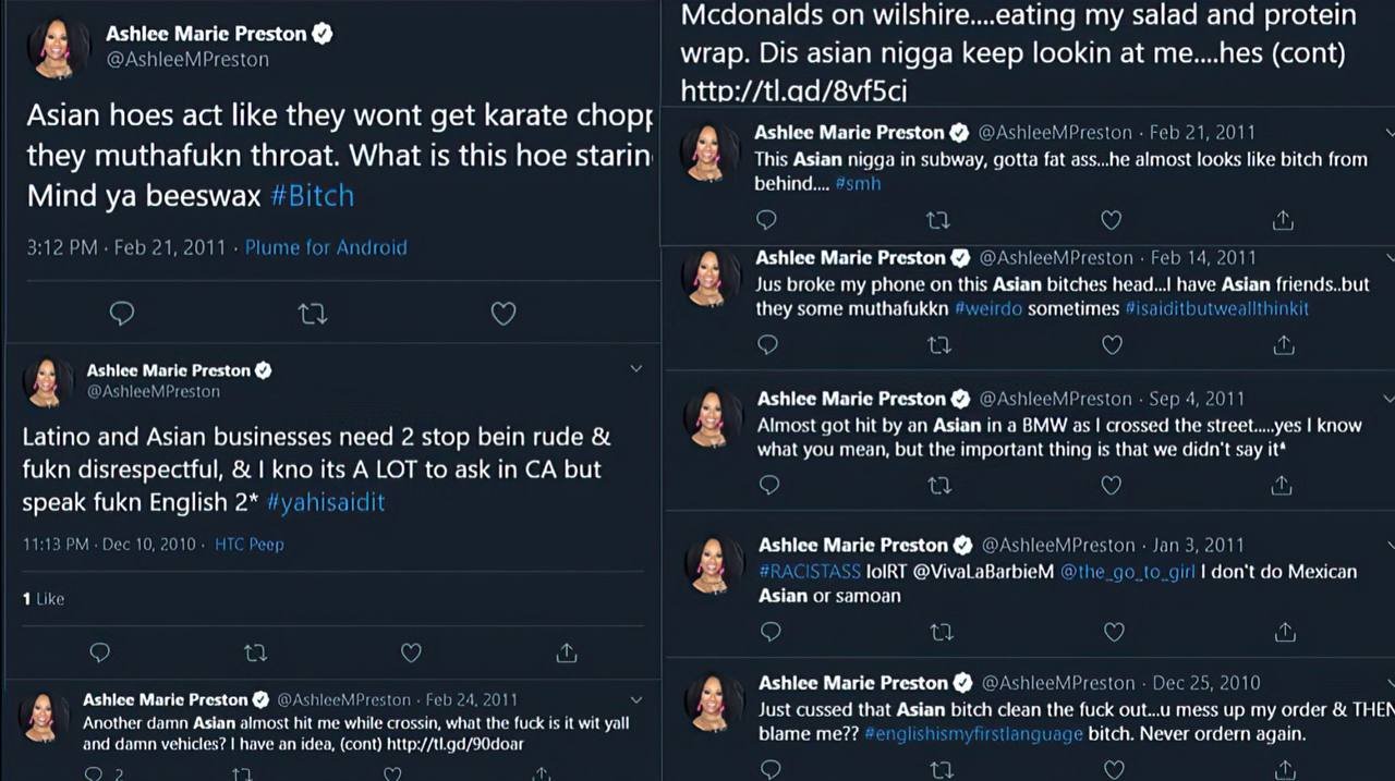 “Latino and Asian businesses need 2 stop bein rude & f*ckn disrespectful, & I kno its A LOT to ask in CA but speak f*ckn English 2* #yahisaidit,” Preston tweeted in 2010.