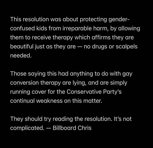 James Decker also opposed the resolution based on his own personal experiences. As gay conservative from Alberta, Decker has spent years warning about the impact of gender policies on gay youth. He has met with Premier Danielle Smith to advocate for sensible approaches to trans that don’t harm gay kids.