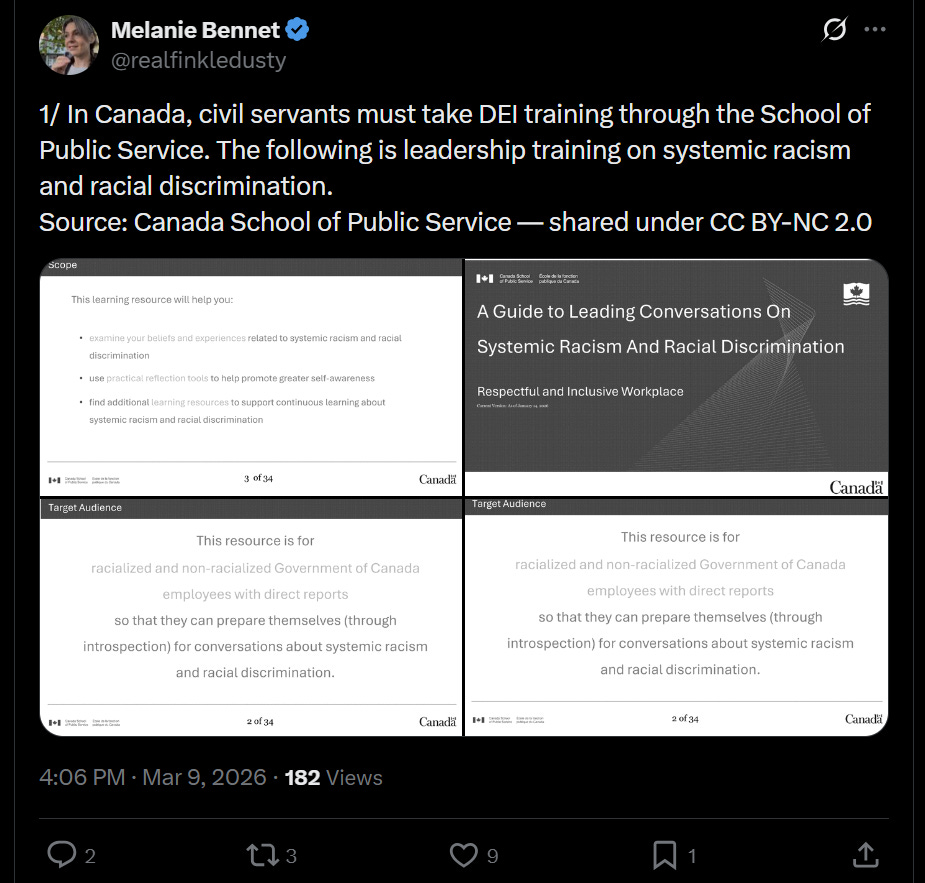 A federal government training program instructs public service managers to advance the careers of “Black, Indigenous, and other equity-seeking” employees through race-based measures and that rejecting the concept of equity is racist.