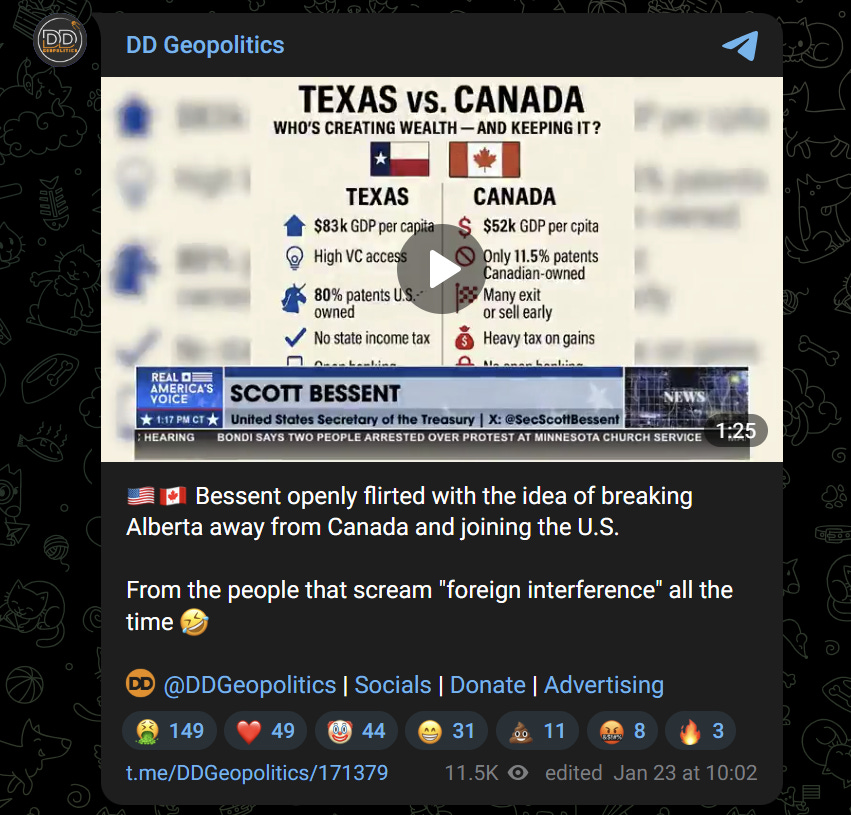When Posobiec pressed him, Bessent claimed that “people are talking,” and that “people want sovereignty” in Alberta.